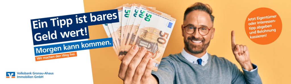 Ein Kunde unseres Hauses oder ein Bekannter von Ihnen möchte sein Haus verkaufen oder kaufen? Ihre Nachbarn ziehen um und verkaufen ihre Eigentumswohnung? Sie wissen von einem Grundstück, das veräußert werden soll? Ob Häuser, Wohnanlagen, Wohnungen, Grundstücke oder Mieteinheiten – geben Sie uns einen Tipp und erhalten Sie als Dankeschön eine Tippgeber Geld-Prämie.